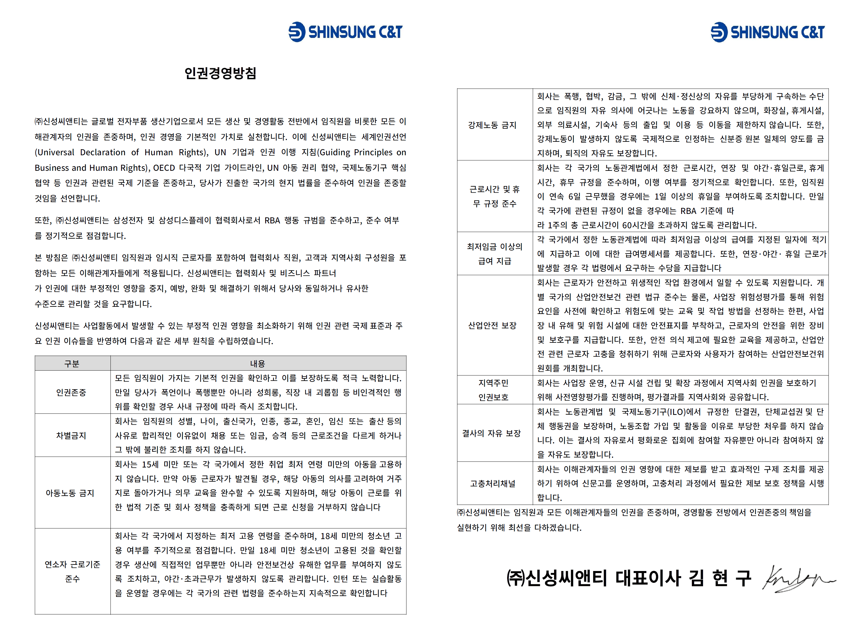 신성씨앤티는 모든 생산 및 경영활동 전반에서 임직원을 비롯한 모든 이해관계자의 인권을 존중하며, 인권경영을 실천하기 위해 노력하고 있습니다.